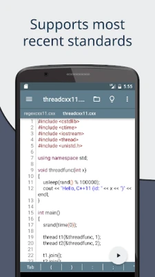 Important notice: Cxxdroid requires at least 150MB free internal memory. 200MB+ is recommended. More if you are using heavy libraries such as Boost.
