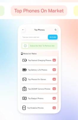 Mobolist app contains best phones according to each category, including Top Premium Flagship Phones, Best Mid-Range Budget Phones, Best Affordable Phones, Best Battery Life Phones, Top Fastest-Charging Phones, Top Camera Phones, Top Selfie Phones, Top Phones for Games, Top Foldable Phones, Best mobile performance according to AnTuTu Benchmark, Best DXOMARK Main Camera and Selfie Camera, GeekBench Best CPU Performance Phones, GSMArena Trending Phones.