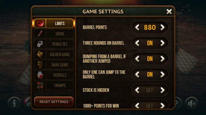 The game continues until one of the players scores 880 points. After the player scores 880 points, he sits on the barrel. Sitting on the barrel, the player stops gaining points without winning the bid. In order for the player sitting on the barrel to win the game, he must win the auction and collect the required number of points - 120 or more. If the player, being on the barrel, does not collect the required number of points, he rolls off the barrel. A penalty may be provided for a certain number of rolls off the barrel. If another player climbs onto the "barrel", then the one sitting on the barrel is rolls off it with a penalty of 120 points. If several players hit the barrel at the same time, then they all roll off with a penalty of 120 points.