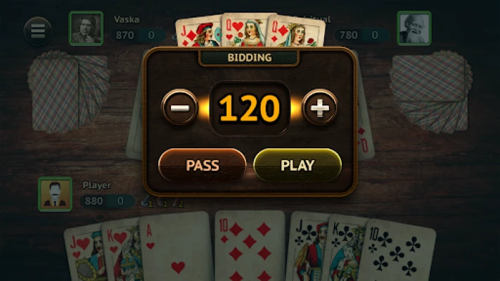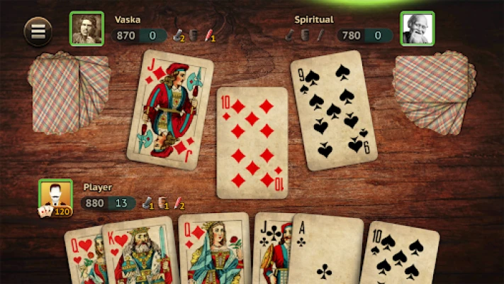 The player who received the buy starts the game - puts the first card on the table. The rest of the players must, in turn, lay down one card of the same suit. If a player does not have a card of the same suit, he has the right to put a card of the trump suit if the trump is declared. If the trump card is not declared or the player has no trump cards, he can discard any card. The player who puts the highest card of the initial suit or the highest trump card on the table takes the table, adding the value of the cards on the table to his round score in the current round.
