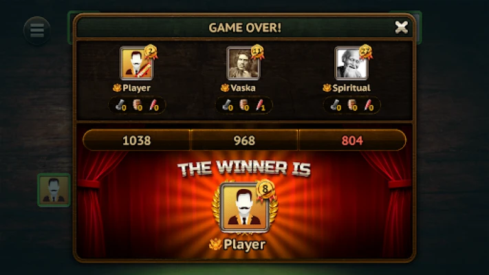 The player who picks up the table begins the next round by placing a card on the table first. The game continues until the players run out of cards. After the cards are over, the scoring begins. If the player who won the buy has not collected the amount that he announced at the auction - the amount announced at the auction is deducted from his total account. If he scored, the sum of the points scored in this bet is added. The rest of the players receive as many points as they have earned in the current round. If the player has not earned a single point per round, he receives a bolt. Having collected the specified number of bolts, the player receives a penalty of 120 points.