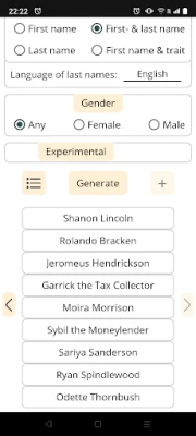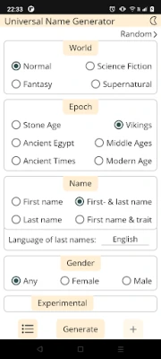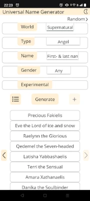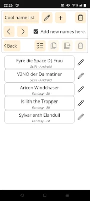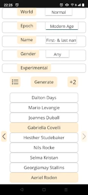 The Universal Name Generator is an easy-to-use tool for generating names from twenty different categories in the following five genres: Epoch, Fantasy, Science Fiction, Supernatural, Random Words. You can save and edit names in your own lists. The app works even when you are offline, without the need for an online account. Additionally, the user interface is easily customizable and it generates nine names at once.