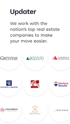 Thousands of real estate companies — like your new apartment community, real estate agent, or moving company — partner with Updater to help you organize and complete your move. We know how stressful moving can be, so we provide end-to-end moving support to help you save time, money, and get settled into your new home. With Updater, you can quickly and easily: